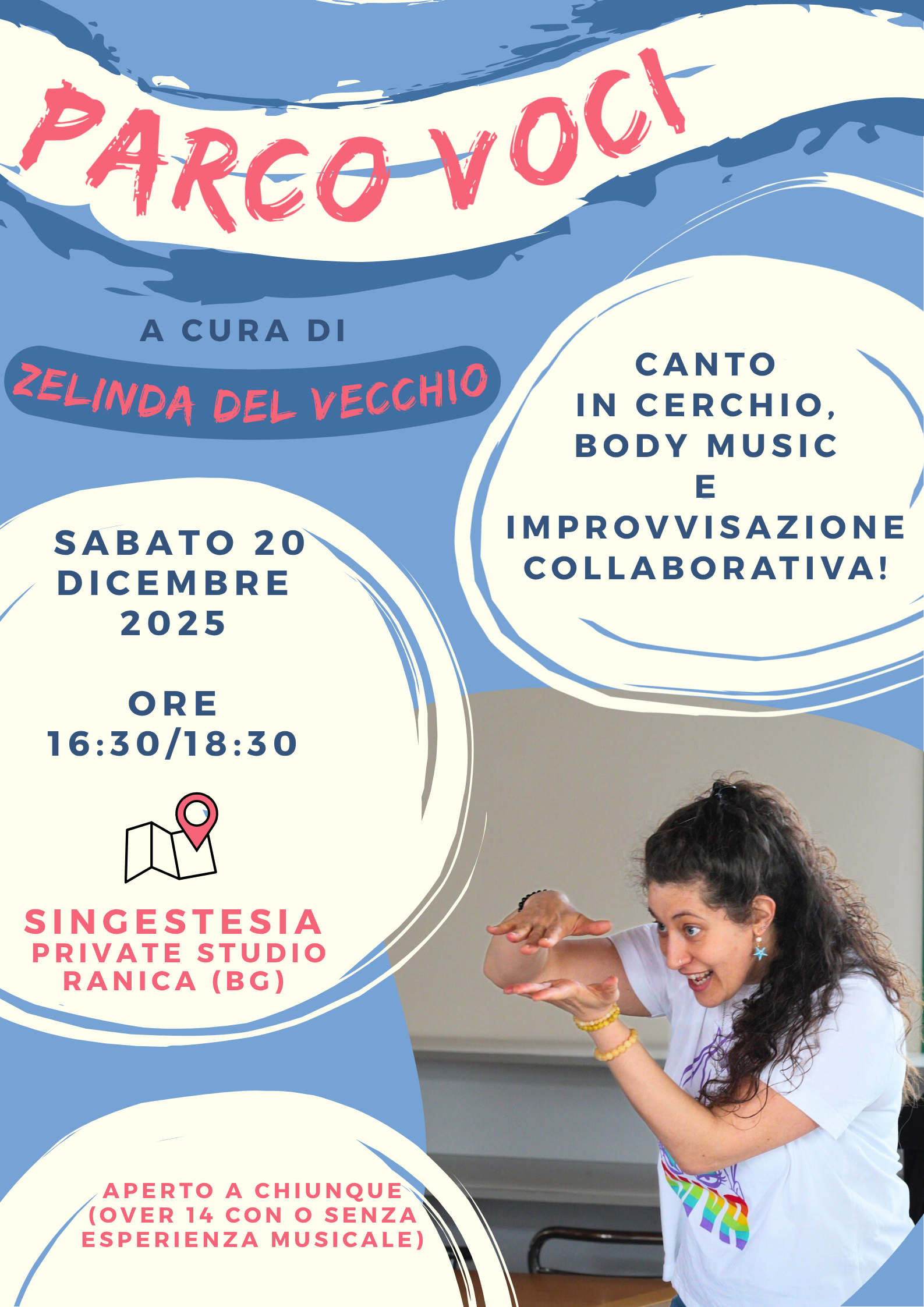 Un laboratorio rivolto ad adolescenti e adultÉ™ a cura di ZELINDA DEL VECCHIO, cantante, insegnante di canto, educatrice musicale, formatrice e facilitatrice di avventure sonore rotonde!