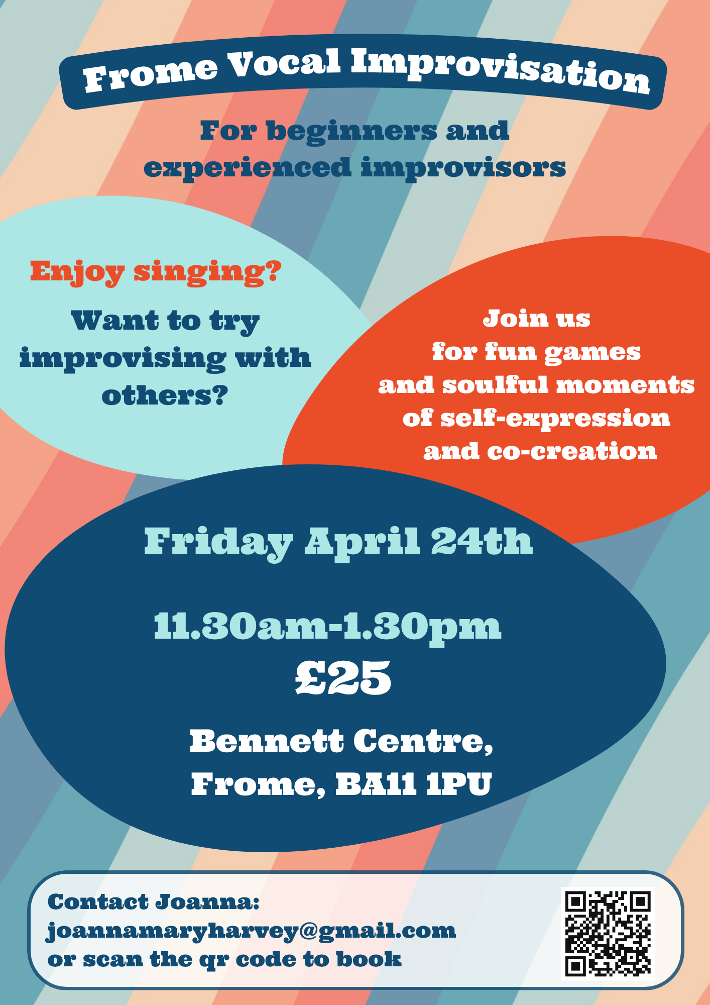 This is a gentle introduction to Vocal Improvisation, paced for a mixed group ranging from beginners to experienced improvisers. It helps if you are quite a confident singer but you don’t need to be trained or hugely experienced, just to love singing and expressing yourself.